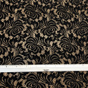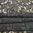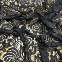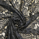 Fall in love with this beautiful lace fabric, perfect for luxurious evening gowns and dresses. In a classic black coloration it has lightly textured surface as well as a slightly crisper drape. Use this timeless lace fabric and layer it on top of a sateen.