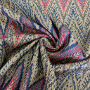 Unique Silver Metalic Visose Jaquard boasts a superb array of rustic hues zig-zagging throughout. Extremely soft in hand. To make the most out of its flexible, dreamlike drape, create comfy crewneck sweaters, vests, or any rerto style dresses, skirts