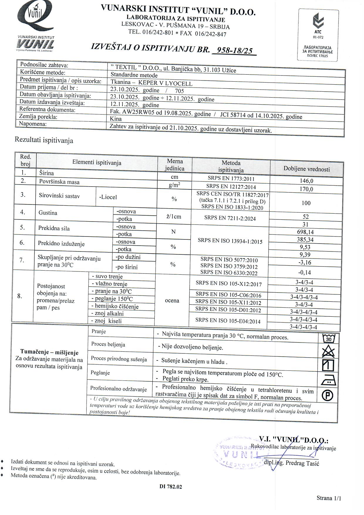 Tkanina od 100% liocela sa karakterističnim keper vezom, izuzetno prijatna na dodir, sa finim, prirodnim padom. Zahvaljujući sastavu, materijal je prozračan, mekan i nežan prema koži, a ujedno zadržava otpornost i stabilnost u šivenju.Idealan je za sve koji teže kombinaciji udobnosti, prirodnog izgleda i ekološke odgovornosti – savršen izbor za pantalone, košulje, haljine i suknje u kolekcijama koje prate ritam savremene i održive mode.