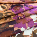 Satin fabric with a beautiful sheen and digital print. The fabric is soft, has a nice drape and is suitable for draping and pleating. It can boast of not wrinkling and being pleasant to the touch, regardless of the composition. It is most commonly used for elegant clothing such as satin dresses, skirts, pants, and shirts.