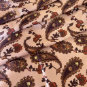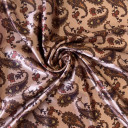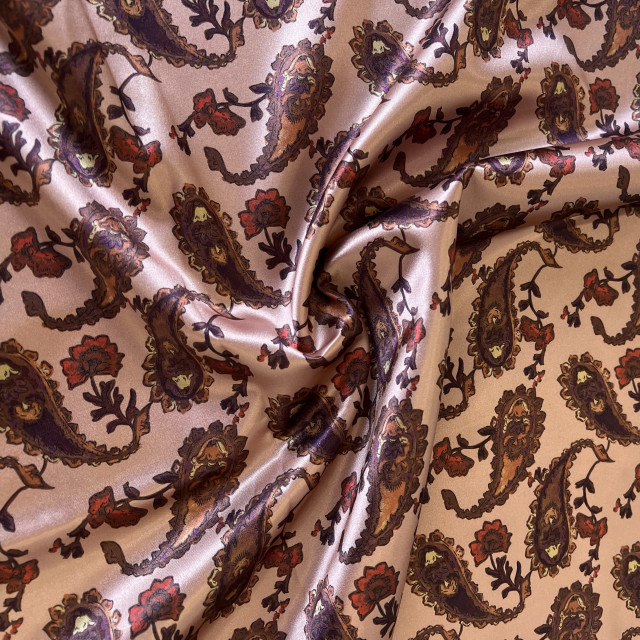 Satin fabric with a beautiful sheen and digital print. The fabric is soft, has a nice drape and is suitable for draping and pleating. It can boast of not wrinkling and being pleasant to the touch, regardless of the composition. It is most commonly used for elegant clothing such as satin dresses, skirts, pants, and shirts.