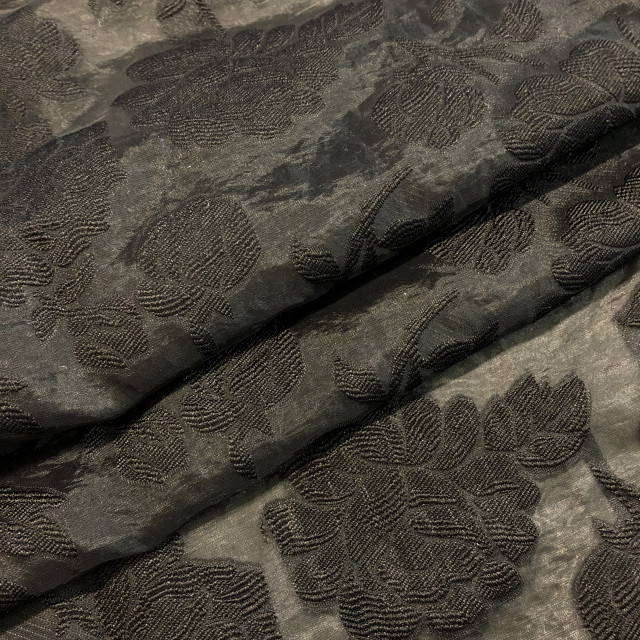 This attractive organza is a transparent fabric with a sharp feel and a feminine, floral jacquard pattern. Don't be fooled by its delicate and sheer appearance, as the material is characterized by exceptional strength. It is suitable for draping, so it is most commonly used for sewing wider models of dresses and skirts that require shape. It also has a gentle sheen, making it a good choice for formal collections, prom dresses, and all those moments when you want to shine.