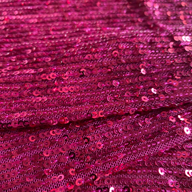 Sequins fabric for sewing dresses, skirts, and pants. Dense and small horizontal sequins, very soft and pleasant to the touch. They stretch lengthwise and have a good drape. Design unique pieces from these attractive sequins such as: suits, blazers, fitted dresses, skirts, shirts, jackets, cardigans, jumpsuits... They can also be used for fashion accessories. The base is semi-transparent, so it can be lined as desired.
