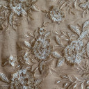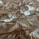 For evening wear collection Floral Embroidered Tulle. Luminous gold is embroidered over a sheer mesh in an ornate floral design. Thin and lightweight, it drapes with ease into gilded cocktail dresses, evening skirts and more! Insert a lining to finish your piece.