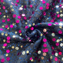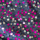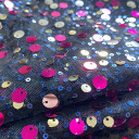 Multi-colour seqiunes on black mesh. Garments created with this roaring mesh will drape fluidly. So enjoy creating faboulos blouses, tunics, skirts and dresses from this playful sequined mesh.