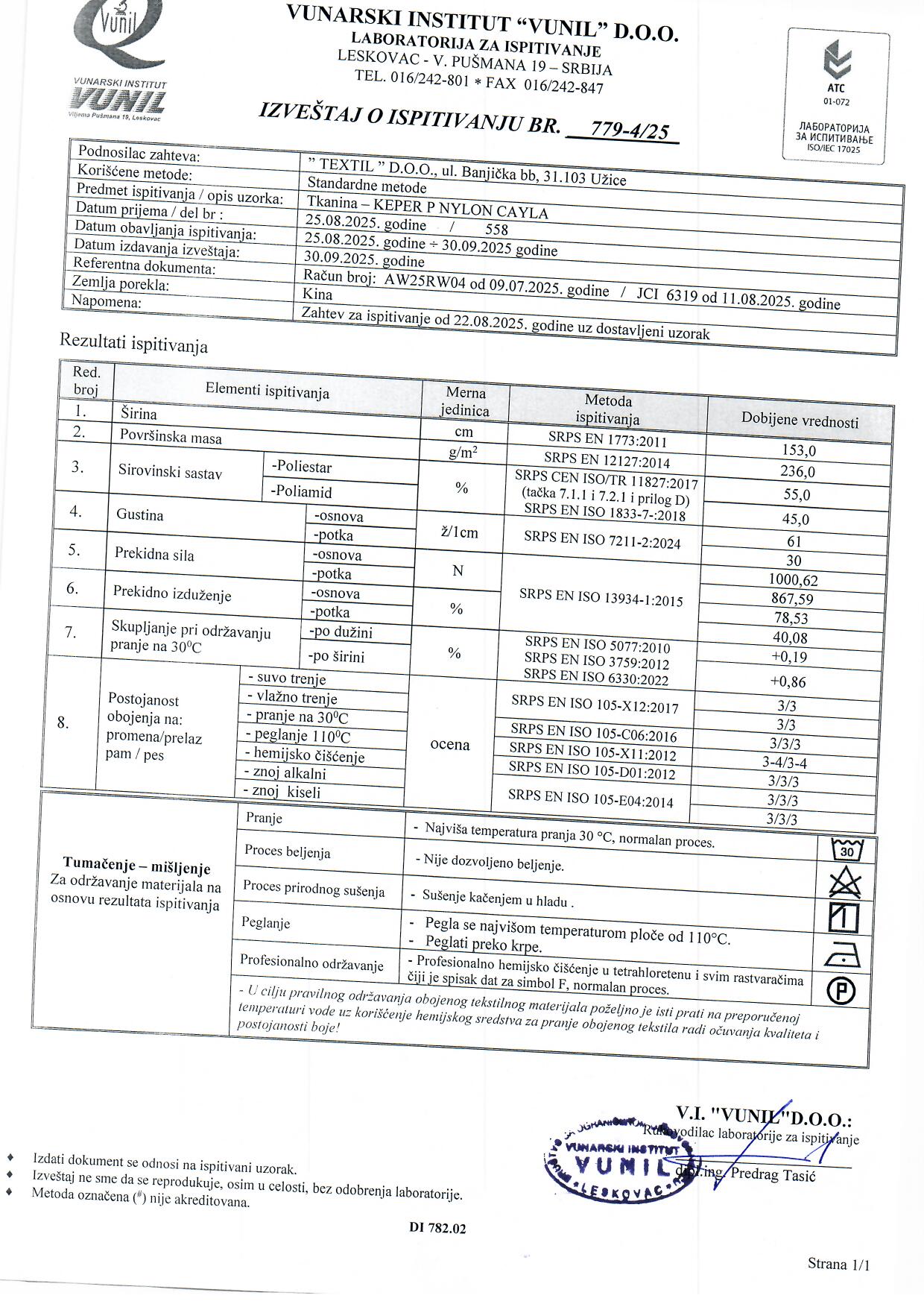 Lagani keper izrađen od mešavine poliestera i najlona, karakteriše ga mekana struktura i lepršav pad. Iako sadrži najlon, materijal ostaje prijatan na dodir i vrlo je pogodan za prolećne i letnje kolekcije. Idealno se koristi za jakne, mantile, lagane pantalone i suknje, ali i kao dekorativni sloj u modnim komadima koji zahtevaju lakoću i pokret. Zahvaljujući keper vezu, materijal zadržava svoju formu, dok mu dodatak najlona pruža otpornost i suptilan sjaj. CAYLA varijanta posebno se izdvaja zbog modernog izgleda i prijatnog osećaja na koži.