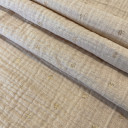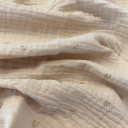 Meka pamučna gaza sa zlatnim foil detaljima koji tkanini daju suptilan sjaj i elegantan izgled. Izrađena od 100% pamuka, ova tkanina je prijatna za kožu, prozračna i udobna, idealna za tople dane. Zahvaljujući svom blago strukturiranom izgledu i sjajnim akcentima, pogodna je za izradu modernih bluza, haljina, tunika, dečije odeće.