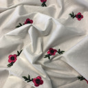 Prirodna pamučna tkanina sa cvetnim vezom u boji. Njen atraktivan dizajn uneće u vaše kolekcije pravo osveženje. Zbog svog pamučnog sastava veoma je mekana i glatka pa je pogodna za šivenje ležernih haljina, košulja, tunika.