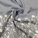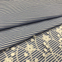 Pamučna tkanina u svevremenom dezenu plavo-bele pruge i vezenom bordurom koja doprinosi romantičnom duhu ovog materijala. Zbog svog mekanog i prijatnog opipa i dodira koji hladi, pogodna je za letnje odevne predmete: maxi i midi haljine, dugačke košulja haljine, bluze i kaftane za plažu...