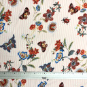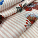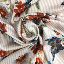Krepasta tkanina, blagog sjaja i zrnaste stukture koja joj pruža jedinstven opip i dobar pad. Štapmana u modernom dezenu neobičnog spoja pruga i sitinih cvetova. Idealna za prolećne i letnje kolekcije, preporučujemo šivenje dugačkih košulja i haljina, kaftana za plažu.