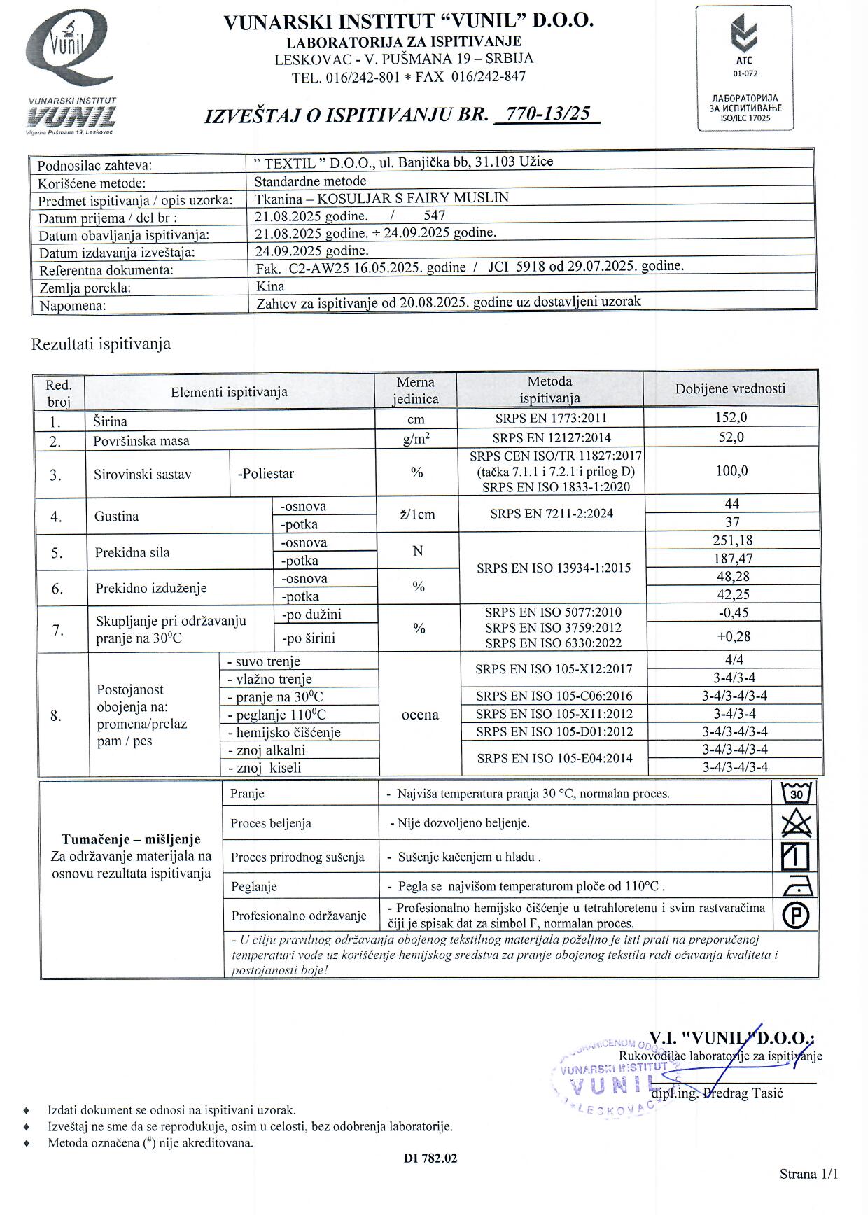 Lepršav i lagan muslin sa lepim padom.Ova tkanina je blagog sjaja koji asocira na elegancjiu i luksuz. Od njega se mogu kreirati haljine, košulje, suknje, tunike. Idealan je za prolećne i letnje kolekcije. Materijal je proziran pa se može postaviti po želji.