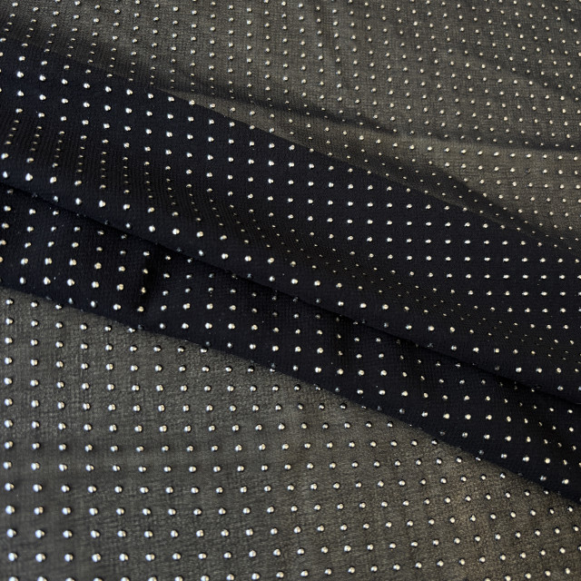 Šifon materijal sa drops foil efektom, inspirisan najnovijim trendovima sa svetskih sajmova, savršen je izbor za svečane odevne komade. Ova varijanta muslina idealna je za izradu košulja, haljina, bluza i kardigana. Krepastog opipa i poluprovidne strukture, pa se može postavliti u skladu s potrebama dizajna.