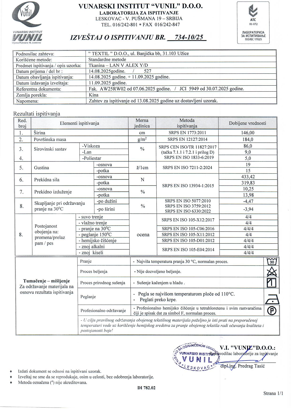 Lan V Alex Y/D je tkanina sa prugastim dezenom, izrađena od mešavine rajona i lana. Zahvaljujući ovom sastavu, izuzetno je meka, prijatna na dodir i lepo pada. Lan dodaje prirodan izgled i blagu teksturu.a pruge klasičan i svež izgled. Idealnom za šivenje košulja, haljina, tunika i laganih letnjih komada.
