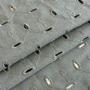 Tkanina LAN V VERIS EYLET odlikuje se prozračnom strukturom i dealnom za toplije dane. Eylet detalji u vidu sitnih perforacija daju tkanini dekorativnu, a ujedno i funkcionalnu notu, poboljšavajući ventilaciju i vizuelni efekat. Pogodna je za izradu letnjih haljina, tunika, bluza i laganih suknji.