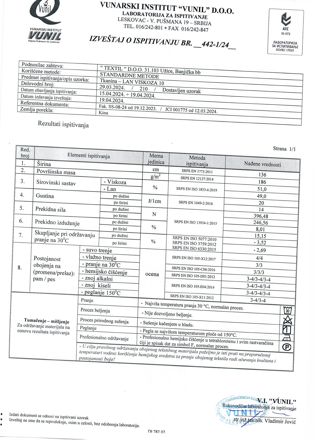 Ova lanena tkanina je prirodni materijal, izuzetno prijatan i udoban, pogodan za tople letnje dane. Po sastavu je kombinacija lana i viskoze što ga čini mekanim na dodir. Ne isteže se i izuzetno je izdržljiv. Pogodan za šivenje letnje odeće kao što su ležerne letnje haljine, lanena odela, bermude, bluze, tunike, suknje, lanene pantalone, kombinezoni...