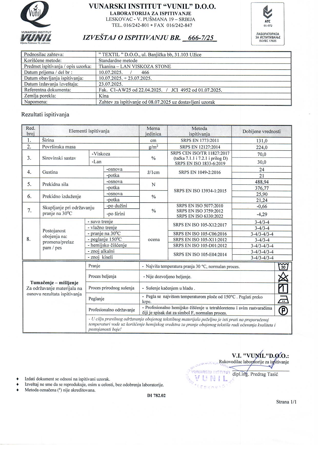 Lanena tkanina u mešavini sa viskozom sa naglašenim prirodnim tkanjem i doradom. Izuzetno je mekan i prijatan. Pogodan je za: haljine, košulje, bluze, tunike, kombinezone, ležerne sakoe, kardigane, suknje.