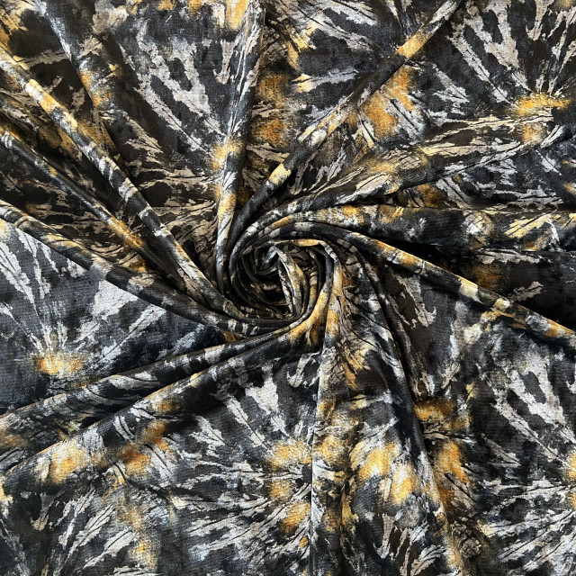 Ako tražite glamurozne kombinacije ovo je materijal za vas! Dezenirani pliš intenzivanog sjaja i izuzetno mekanog opipa. Digitalno štampan, što omogućava neverovatno detaljan i jasan dizajn. Koristi se za izradu haljina, elegantnih odela, pantalona, suknji, bluza, jakni, kardigana, pa čaki i trenerki - ovaj materijal je pogodan za sve!