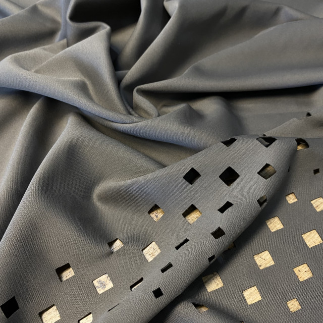 Laserski sečena skuba sa atraktivnim geometrijskim dezenima. Mekana i udobna, pogodna je za kreiranje haljina, suknji, majci, kombinezona, pantalona.