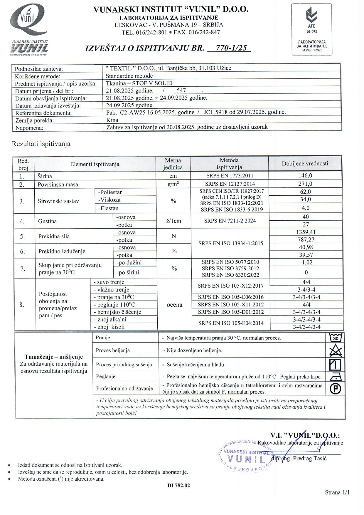 Jednobojan viskozni zimski štof, mekan i prijatan, može se koristiti u modnom i casual programu za pantalone, suknje, sakoe, prsluke. U prolećnim kolekcijama idealan je za mantile svih krojeva i formi.