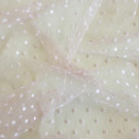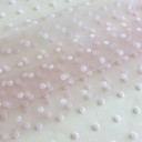 TIL N MESH FLOCK je mrežasta tkanina sa flok tufnama. Zahvaljujući kombinaciji prozirne osnove i baršunastih, uzdignutih tačkica, ova tkanina deluje atraktivno na odevnim komadima. Idealan je izbor za modne detalje, efektne bluze, haljine, slojevite modele i dečiju konfekciju.